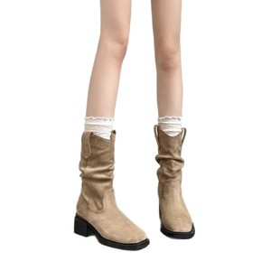 牛皮版~磨砂绒面V口西部牛仔靴女复古风中筒靴高跟套筒显瘦堆堆靴
