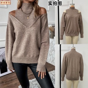 2025亚马逊跨境欧美新款秋冬纯色宽松时尚针织露肩长袖高领毛衣