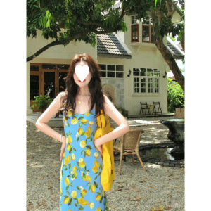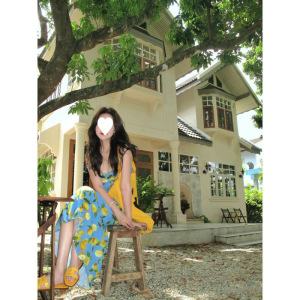 海边多巴胺度假风裙子蓝色柠檬印花吊带连衣裙女夏沙滩氛围感长裙