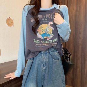 美式复古插肩袖字母印花圆领长袖恤女装春季宽松百搭休闲上衣