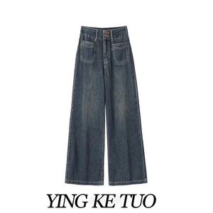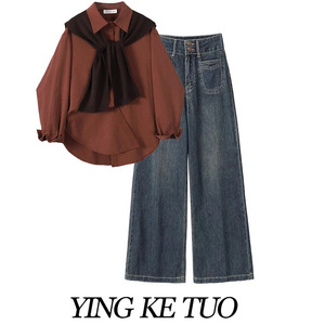 韩系宽松显瘦披肩衬衫女装秋季新款别致时尚百搭直筒牛仔裤两件套