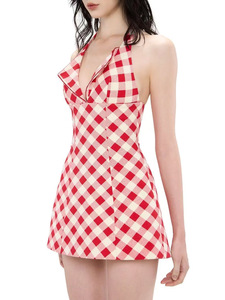 越南小众设计LSOU*短裙25新款格纹露肩绑带挂脖修身A字连衣裙女