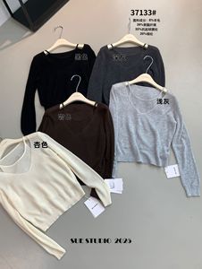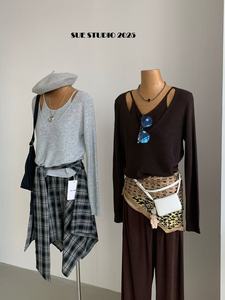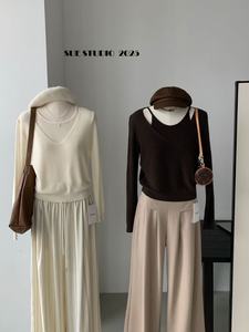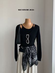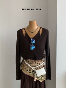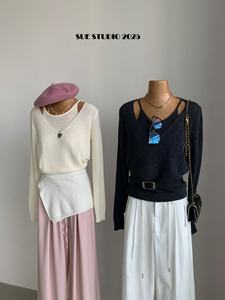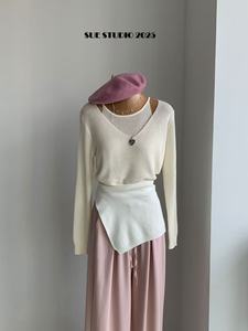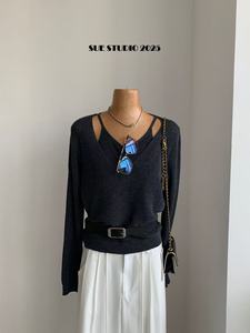 SUE韩系优雅复古V领修身撞色毛衣针织衫秋季新款假两件上衣37133