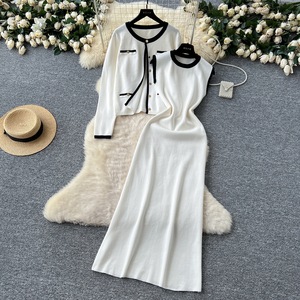 小香风两件套女秋冬高级感百搭圆领针织开衫外套+无袖背心连衣裙