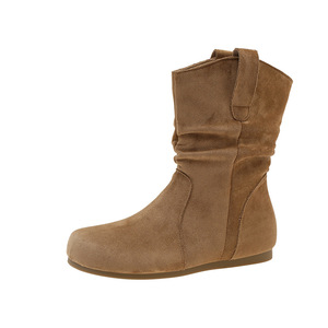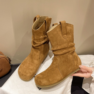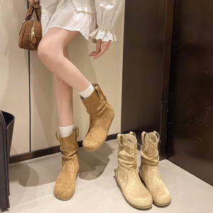 复古内增高慵懒风褶皱短靴女秋冬马丁靴圆头配裙子显瘦堆堆靴大码