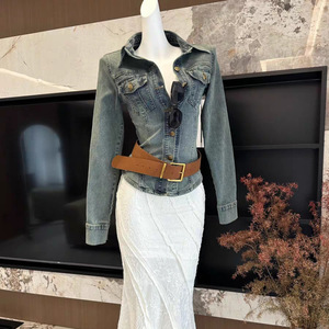 韩版网红辣妹美式复古气质做旧水洗牛仔外套+腰带