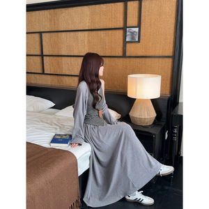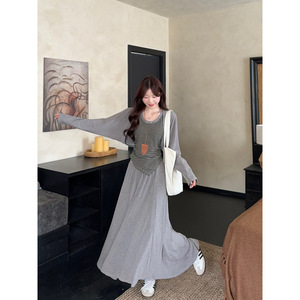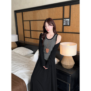 2025秋季新款韩版慵懒舒适开衫不规则条纹背心半身裙三件套