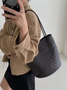 头层牛皮单肩小水桶包2025新款夏日度假风真皮手工编织包女手提包