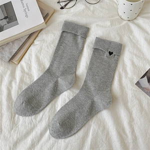 灰色翻边爱心袜子女秋冬女士中筒袜纯色欧货时尚百搭春秋堆堆袜