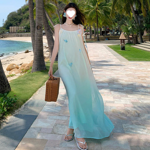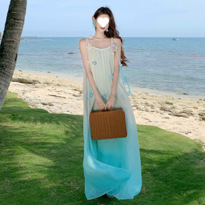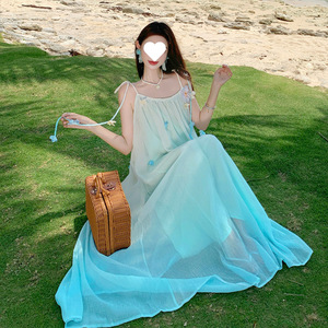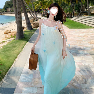 渐变蓝度假风仙气重工裙立体花朵吊带气质法式