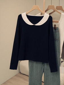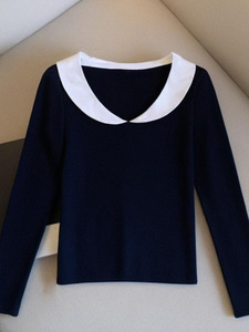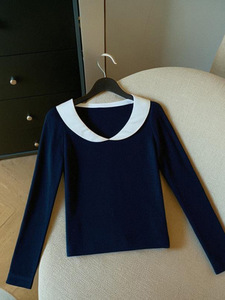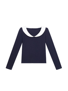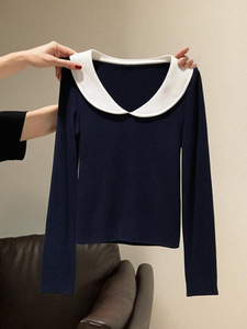 藏青色娃娃领正肩长袖t恤女早秋季修身紧身内搭打底衫大领口上衣