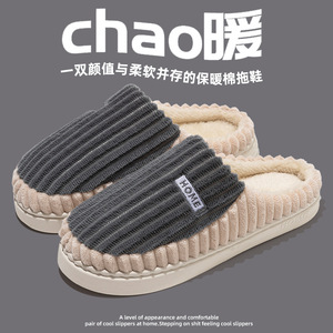 棉拖鞋女秋冬季居家厚底防滑加绒保暖双色拼接竖条情侣款棉拖鞋男