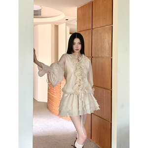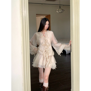现货秋新款米色领花边灯笼袖衬衫+打底短裤法式复古两件套