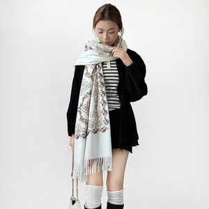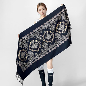 秋冬新款高级仿羊绒围巾女围脖保暖围巾两用绣花装饰流苏披肩批发