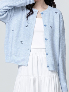 蓝色圆领针织开衫女2025春秋新款宽松设计感薄款毛衣外套短款上衣