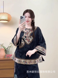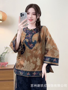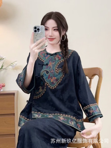 2025新款新中式文艺国风缎面人丝衬衫女民族风复古刺绣盘扣衬衫