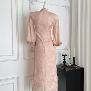 Q3796修身优雅新中式珠光提花改良旗袍早秋季旗袍领镂空连衣裙子