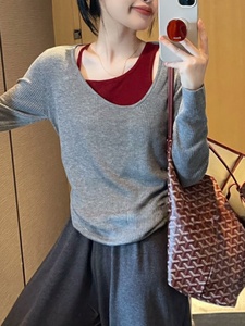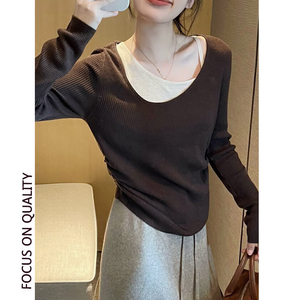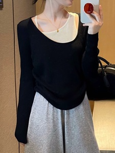 假两件打底衫女春季2025新款chic长袖宽松套头毛衣内搭不规则上衣
