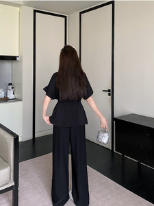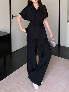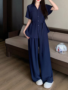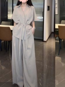 2025夏装新款胖mm大码女优雅气质绑带收腰衬衫上衣宽松阔腿裤套装
