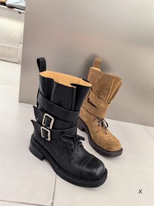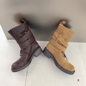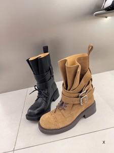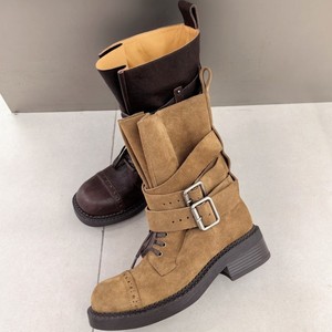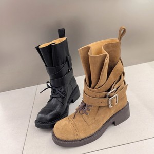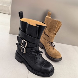 欧洲站XJ女鞋25秋冬时尚皮带扣小牛皮牛猄皮圆头套筒平底骑士短靴