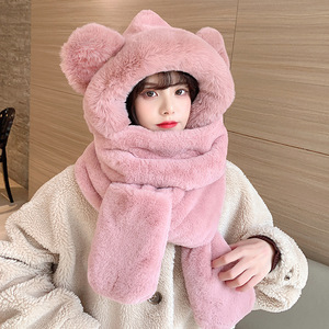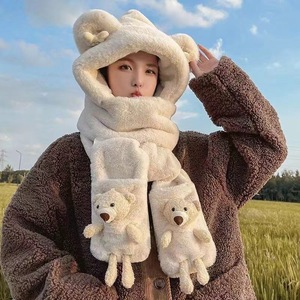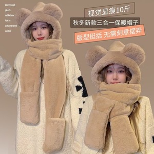 小熊帽子韩版可爱女百搭秋冬季帽子围巾一体保暖手套围脖三件套潮