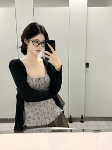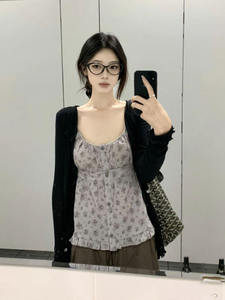 韩系温柔风吊带背心女早秋季2025新款轻薄黑色开衫碎花上衣两件套