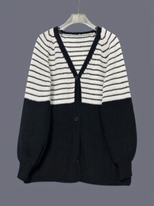 欧美女装秋冬新款黑白条纹针织毛衣慵懒风宽松开衫针织毛衣外套