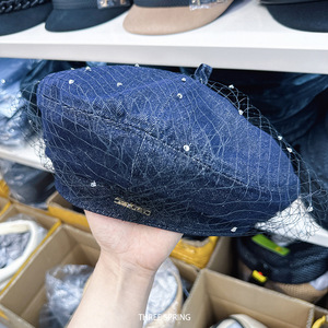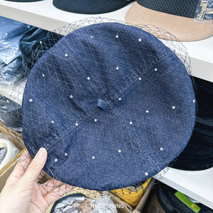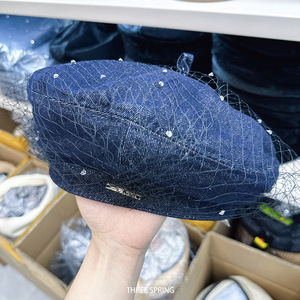 批发韩国2025年秋冬新款牛仔网纱水钻贝雷帽女大头围显脸小画家帽