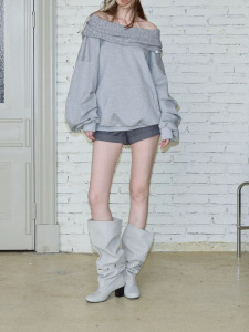 【博尔赫斯】斜肩一字领宽松套头连帽卫衣露肩上衣女