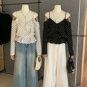 WGWE6956薄款一字肩衬衫露肩上衣女设计小众波点长袖雪纺衫