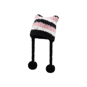 帽子女猫耳朵条纹毛线帽冬季帽子双毛球保暖帽皮标毛绒护耳针织帽