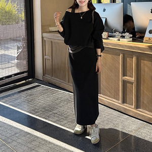 抖音爆款2025秋季新款设计感假两件露肩上衣+显瘦半裙两件套套装