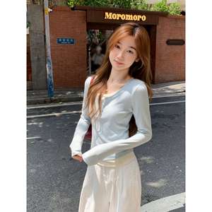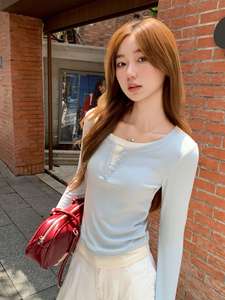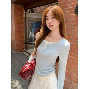 韩版撞色假两件圆领长袖t恤女2025秋季新款修身显瘦内搭打底上衣