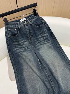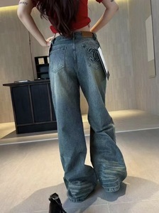 cha双C正确版美式复古做旧水洗阔腿裤辣妹牛仔直筒裤拖地裤长裤