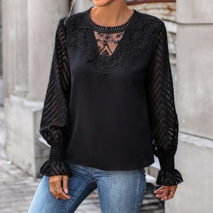 欧洲外贸2025新款秋季跨境优雅复古风喇叭长袖蕾丝拼接纯色衬衫女