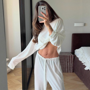 米色针织宽松长袖长裤可外穿睡衣两件套2025欧美秋季新款家居服女