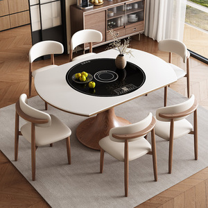 可伸缩实木岩板餐桌圆形暖菜电磁炉智能语音电动转盘方圆两用饭桌