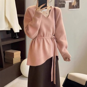 欧货V领腰带中长款绵羊绒毛衫女秋冬宽松针织羊毛内搭打底毛衣