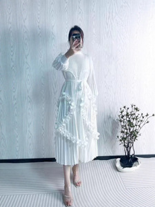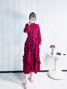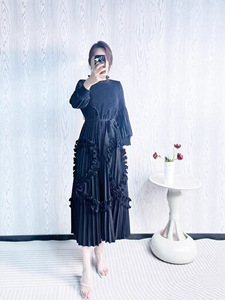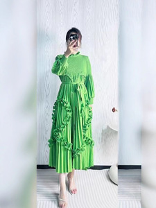 欧美宫廷风烫金连衣裙褶皱木耳边高端重工跨境宽松收腰连衣裙