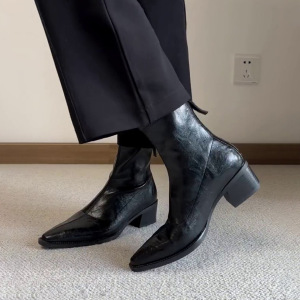 羊皮版~复古粗跟显瘦尖头弹力显瘦短靴后拉链通勤气质高跟时装靴
