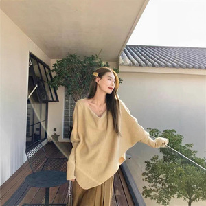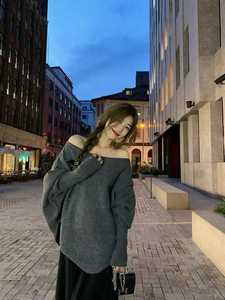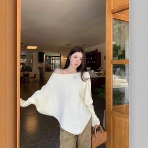 温柔风韩版蝙蝠袖针织毛衣女2025秋冬新款一字领慵懒不规则上衣潮