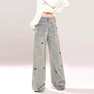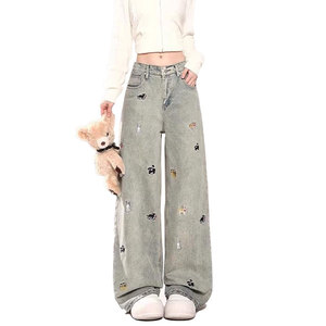 卡通可爱小狗刺绣牛仔裤女秋夏季大码阔腿胖mm休闲宽松百搭直筒裤