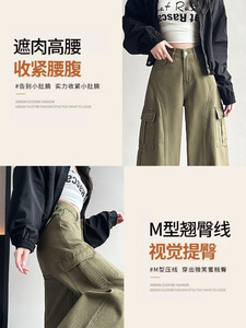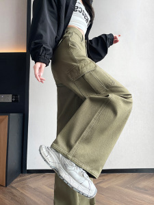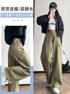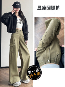 军绿色工装阔腿牛仔裤女秋季2025新款高腰宽松设计感拖地直筒裤子