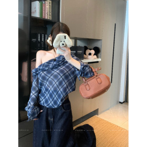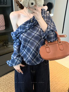 PUKI 原创格纹微透显瘦设计感T恤一字领斜肩衬衫上衣