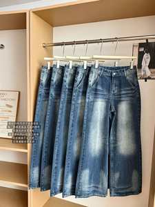 换个色调 后贴盖深蓝斑驳扎花牛仔裤女宽松休闲裤