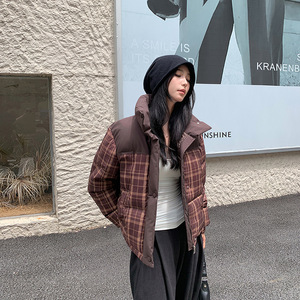 韩国短款棉服女印花拼接2025冬季新款立领加厚保暖棉袄时尚潮外套