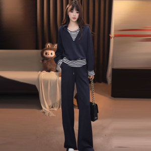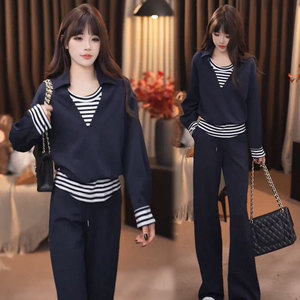 时尚休闲套装女2025秋季新款洋气条纹拼接假两件上衣阔腿裤两件套