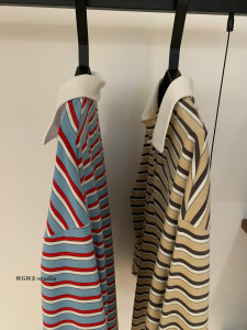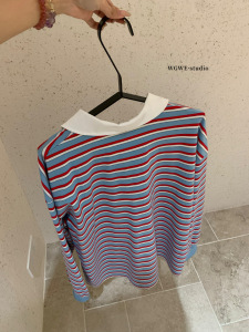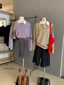 【WGWE】7009早秋新款韩版显瘦撞色条纹翻领长袖T恤女宽松休闲上