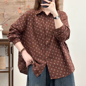 春秋新款韩版宽松休闲百搭文艺印花双层棉纱长袖衬衫女上衣衬衣