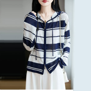 【厂家直供】秋季新款撞色条纹连帽针织开衫外套女士毛衣减龄外搭
